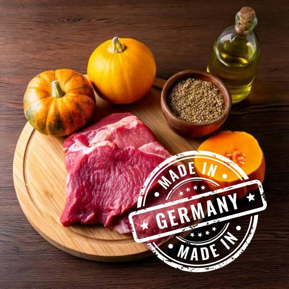 Dieses Futter wird in Deutschland mit Rohstoffen aus verantwortungsvoller deutscher Produktion hergestellt. Das verwendete Rindfleisch kommt aus deutscher Haltung und wird nicht aus Übersee importiert, um mehr Tierwohl zu gewährleisten und eine Medikamentenbelastung des Fleisches zu vermeiden.