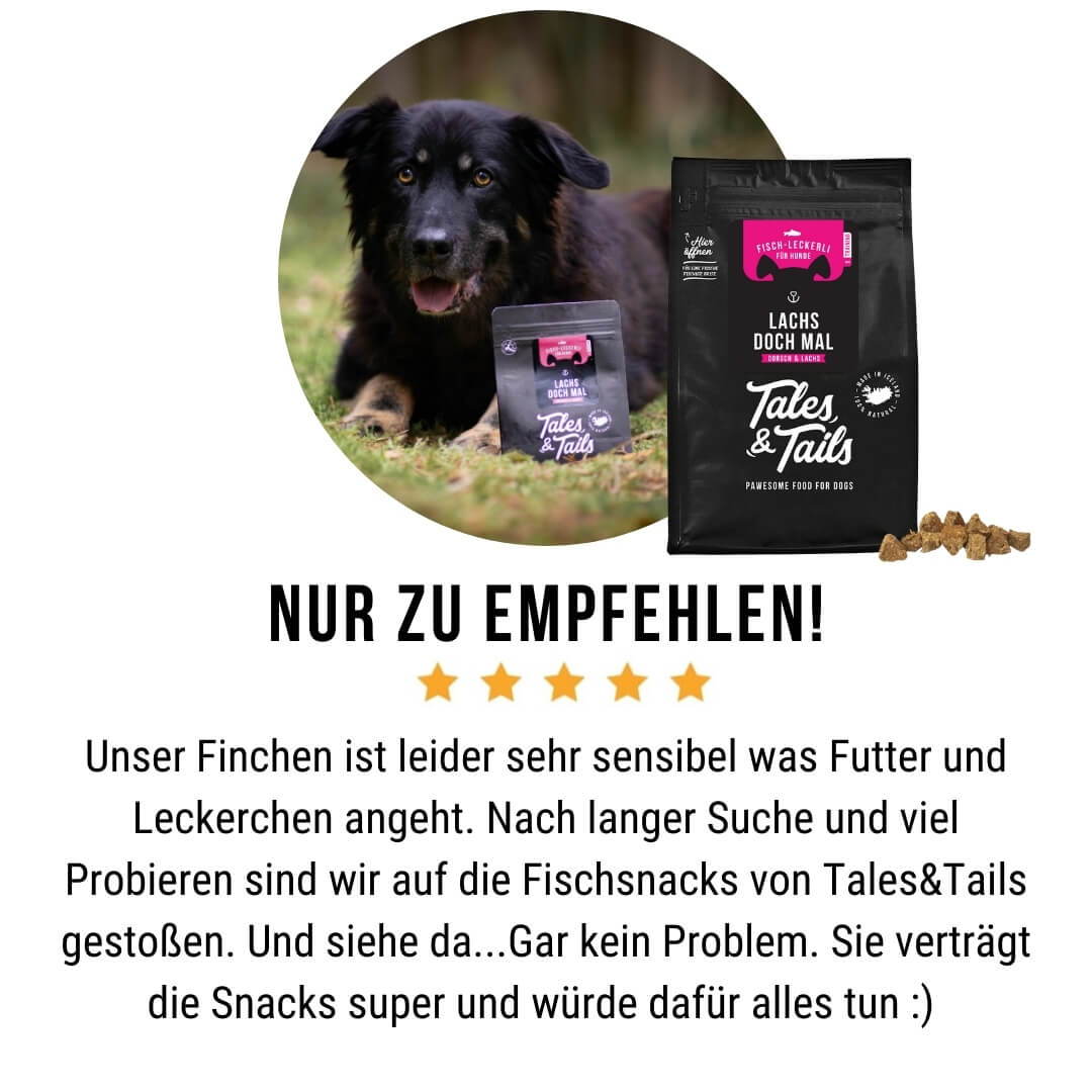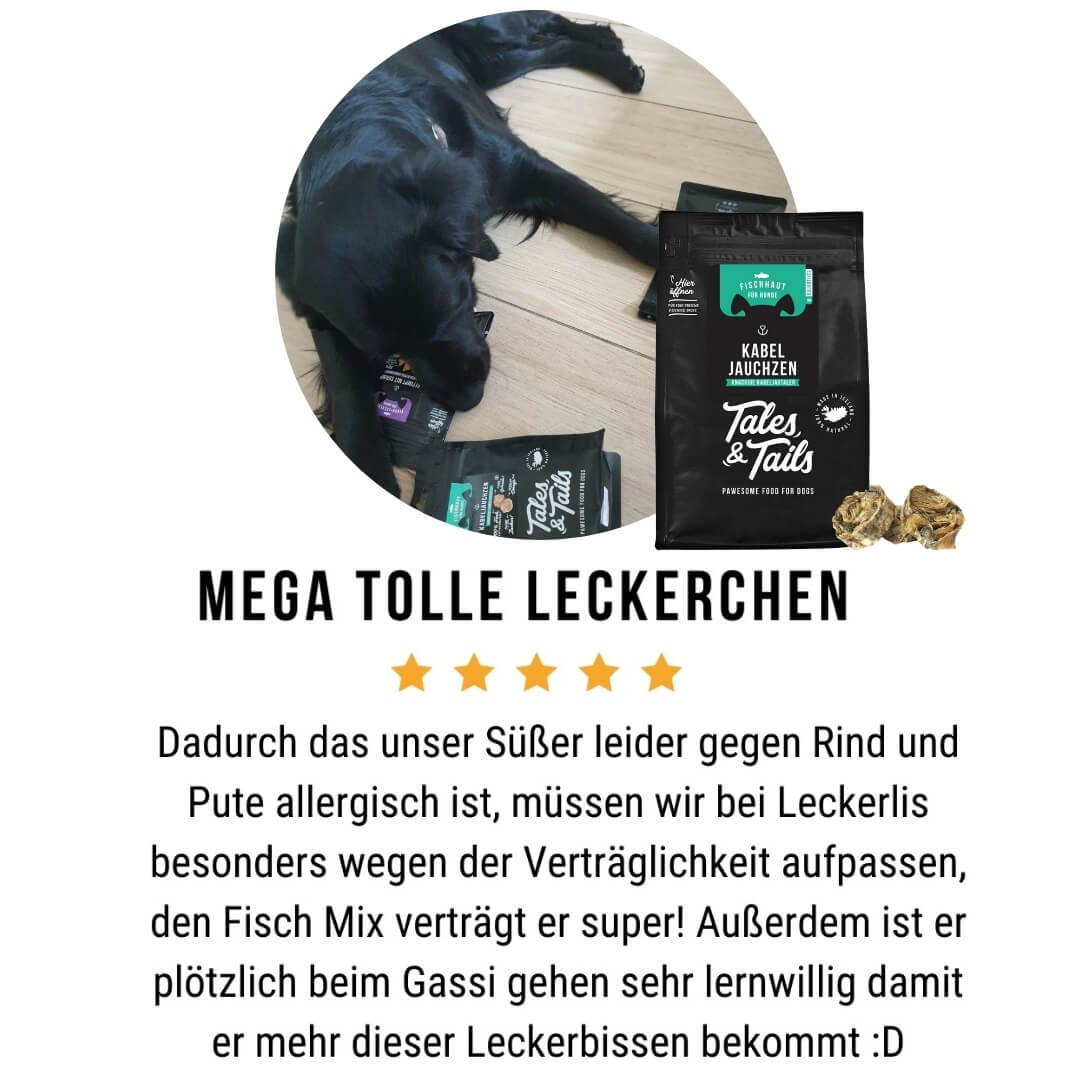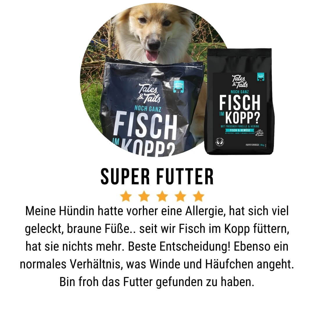 In meiner Verzweiflung bin ich dann auf Tales&Tails und das Trockenfutter: Fischkopp gestoßen und muss sagen: Yippie! Das war das Beste was uns passieren konnte.