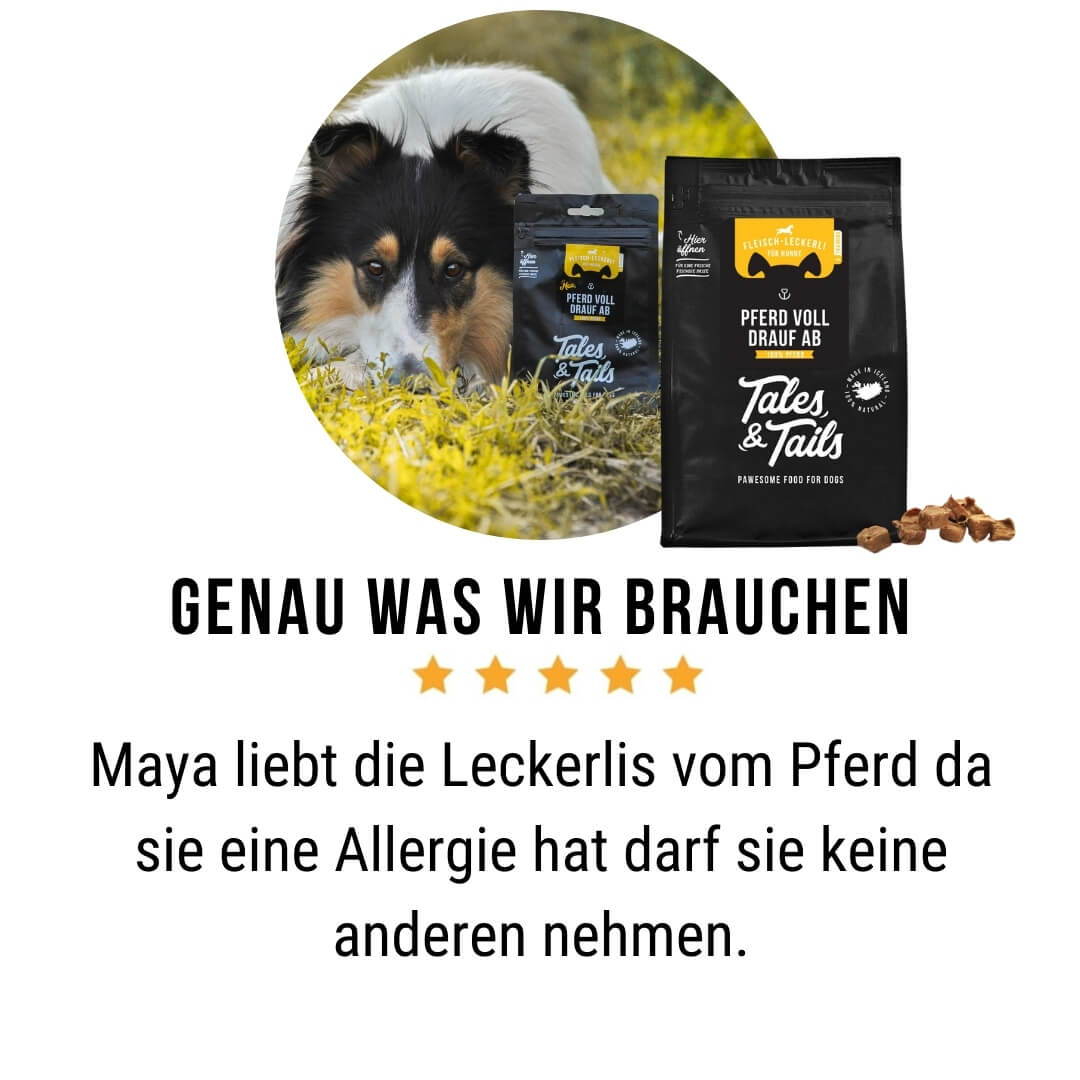 All das können wir mit unseren Produkten erfüllen. So könnt ihr sowohl unser Futter, als auch unsere Leckerli füttern, wenn ihr gerade eine Ausschlussdiät mit eurem Hund macht.