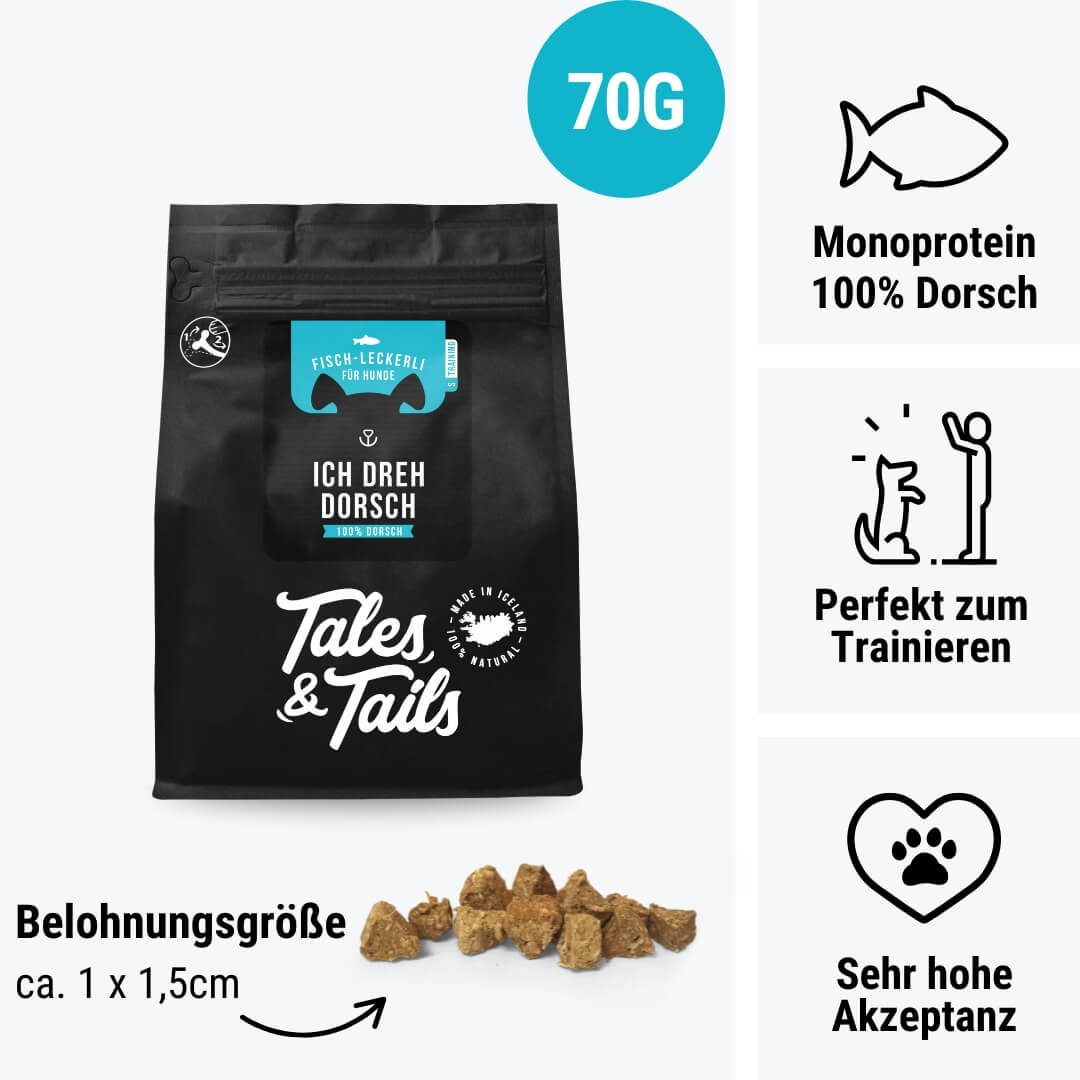 Bei diesen Leckerlies dreht man förmlich dorsch! Schon das Rascheln der Tüte setzt Endorphine frei und selbst wenn man es schafft die Fischlies unbemerkt hervorzuholen, wird spätestens die Verbreitung des typischen Geruchs in Sekundenschnelle für gespitzte Ohren und erwartungsvolle Augen sorgen.