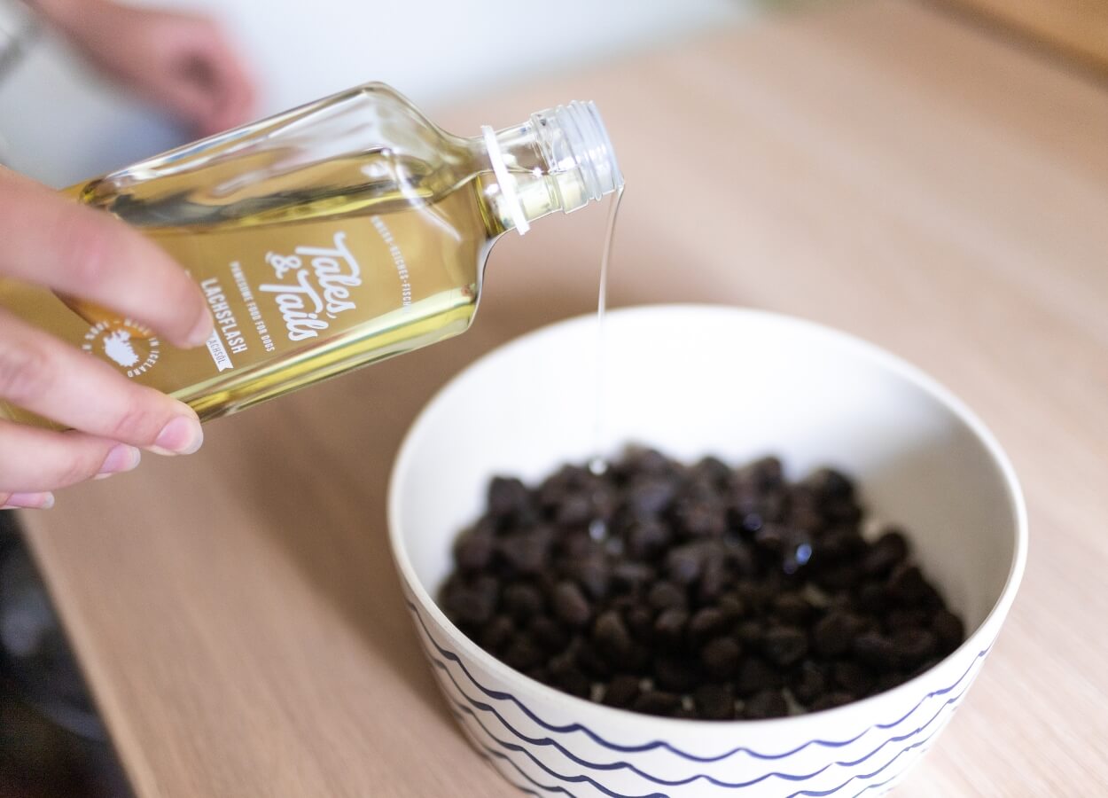 Lachsöl lässt sich unkompliziert über Nass- oder Trockenfutter geben. Viele Hunde lieben das intensive Aroma. Auch in selbstgemachten Leckerlis macht sich das Öl gut.