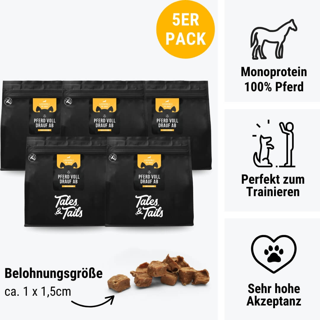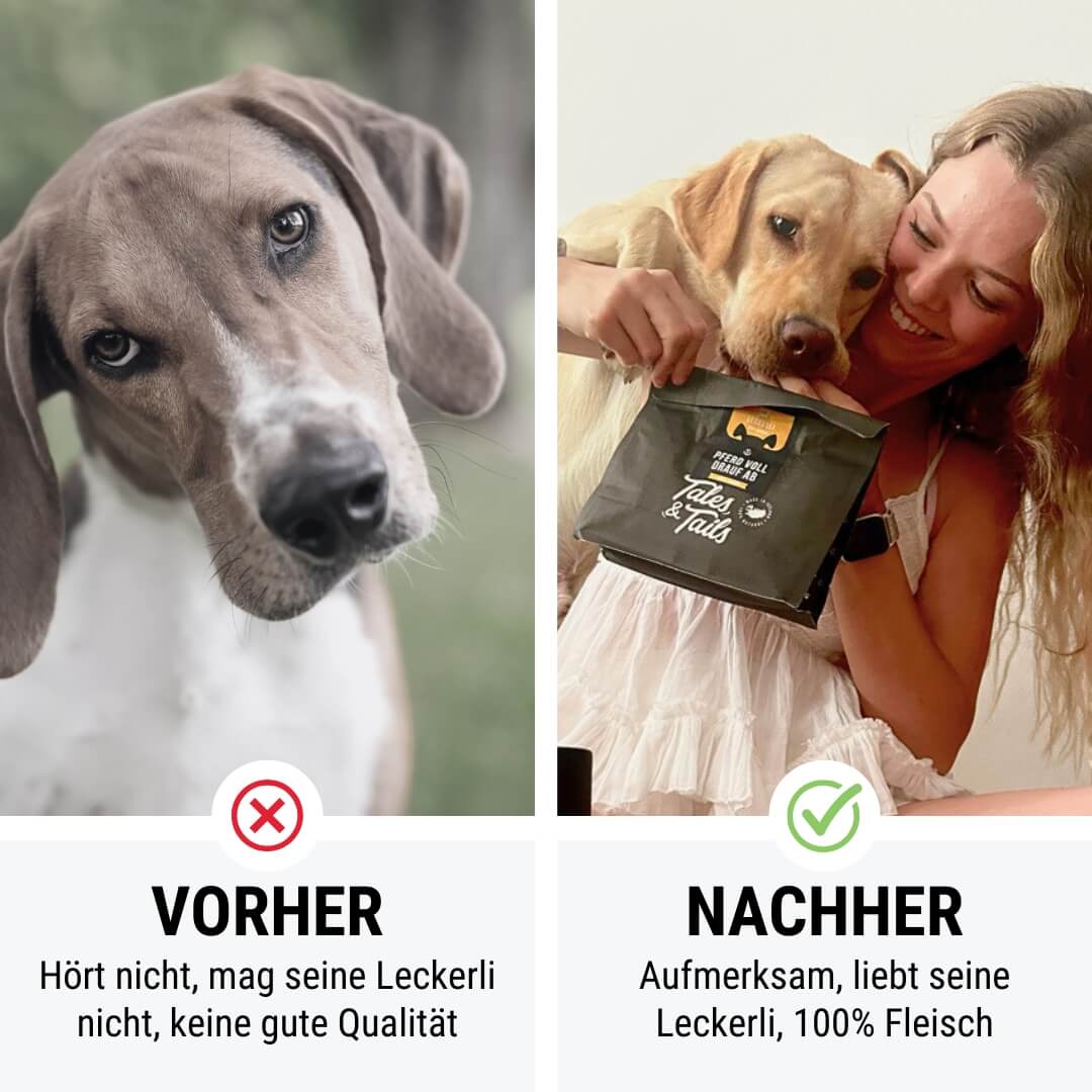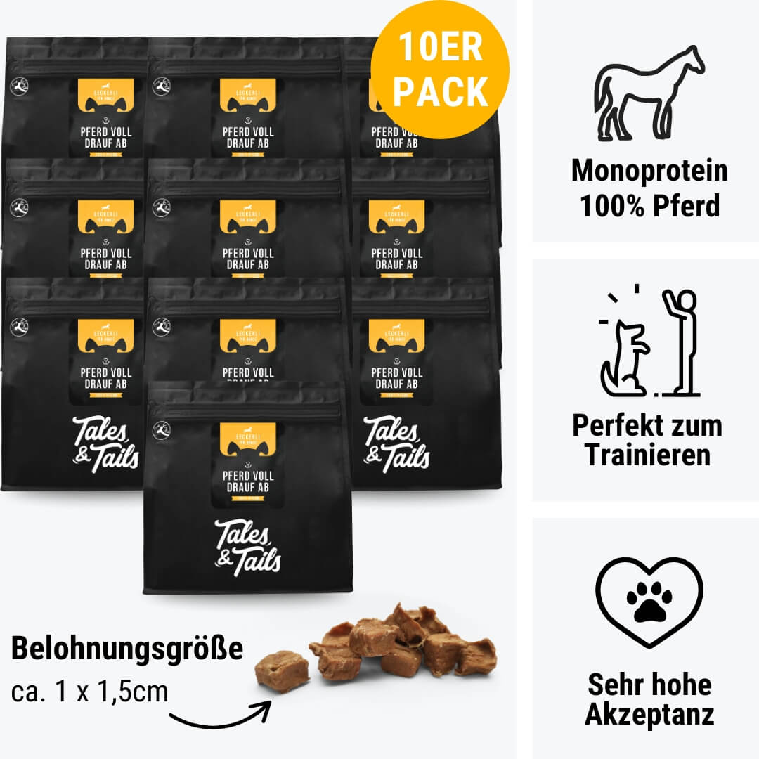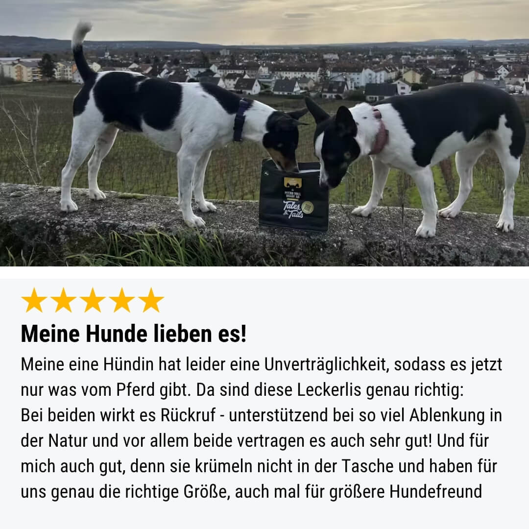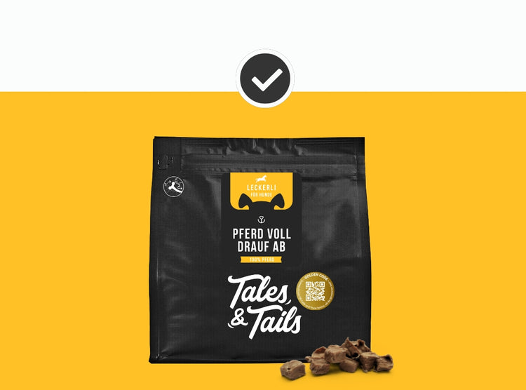 Na, welche Fleischsorten mag dein Vierbeiner am liebsten? Mittlerweile gibt es Snacks in unzähligen Sorten. Aber so viel brauchst du gar nicht. Wichtig ist, dass die Leckerchen deinem Hund schmecken und dass er sie gut verträgt. Denn auch, wenn es nur um kleine Leckereien geht, können diese Allergien auslösen. Anzeichen dafür sind etwa Juckreiz, nässende Hautstellen oder Durchfall. Deshalb solltest du auch bei den Snacks aufs richtige Pferd setzen – auf Tales & Tails. Unsere Pferdeleckerlies für Hunde bestehen zu 100 % aus frischem Pferdefleisch und befördern deinen Vierbeinern im Nu auf Wolke 7 – denn Liebe geht bekanntlich durch den Magen.