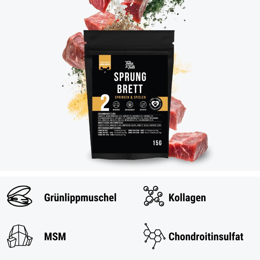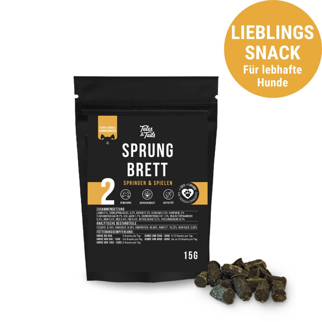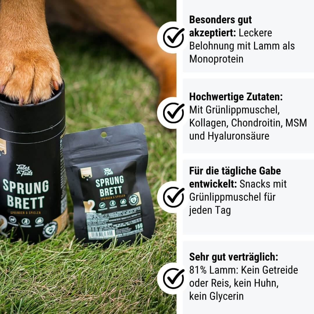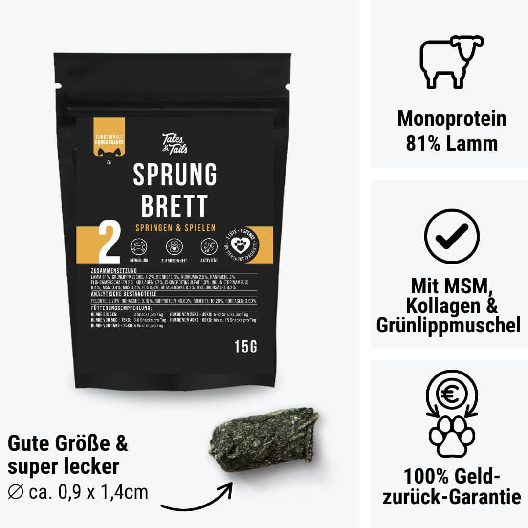"Sprungbrett" basiert auf 81% Lamm als köstliches Monoprotein. Ergänzt wird der leckere Snack durch eine wertvolle Kombination ausgewählter Inhaltsstoffe wie zum Beispiel Grünlippmuschelpulver, MSM, Kollagen und Chondroitinsulfat.