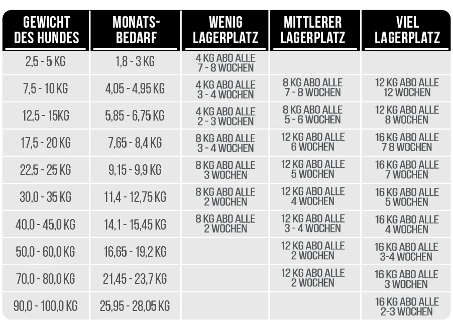 Gern helfen wir dir bei der Berechnung der richtigen Menge und des passenden Intervalls. Du kannst uns dazu jederzeit kontaktieren. Wir haben hier schon mal eine kleine Übersicht für dich erstellt, welches Abo zu dir passen könnte: